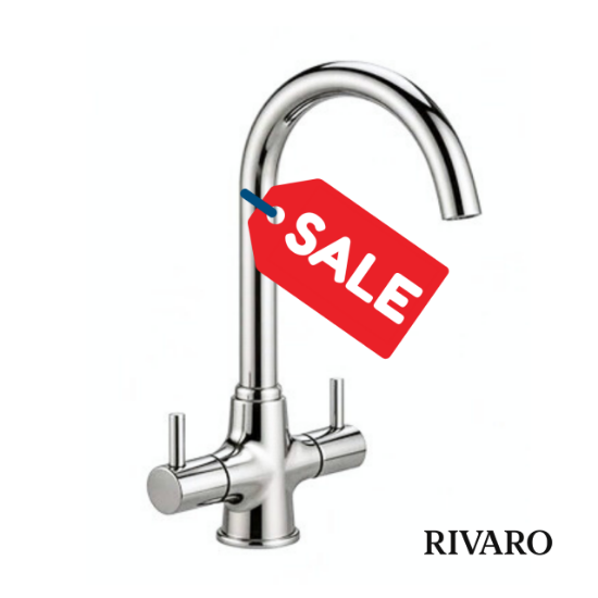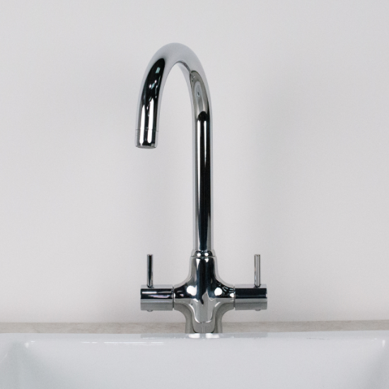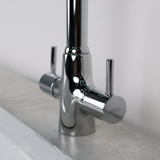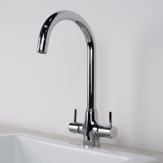 Precision-engineered from brass in Italy, our Onda kitchen mixer tap is a stylish choice for any kitchen. The tap has a sleek polished chrome finish with swan neck spout, plus hot/cold etching on the handles.